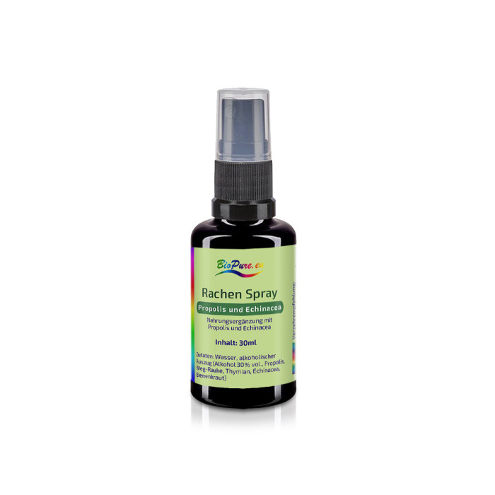Wasser, Alkohol, Propolis, Thymian, Echinacea, Ysop und Wegrauke